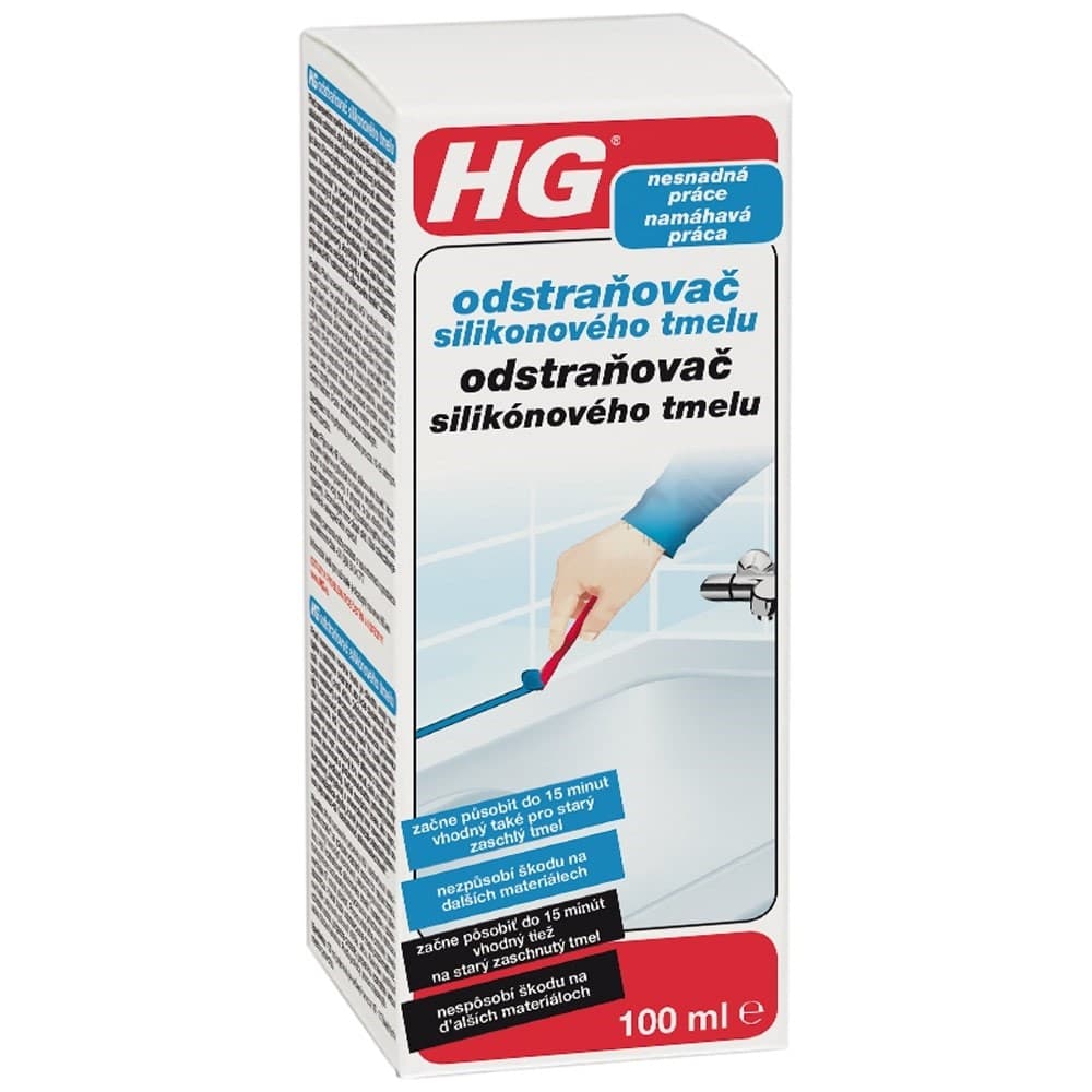 HG odstraňovač silikonového tmelu odstraňuje silikon z povrchů jako je nerezová ocel, smalt, sklo, různé druhy plastů, keramické obklady a dlažba, přírodní kámen a podobné povrchy. HG odstraňovač silikonového tmelu příjemně voní, snadno se nanáší a nepoškozuje zmíněné povrchy. Mnoho jiných druhů tmelů, jako butylen-, akrylát- a univerzální tmel, zanechává zbytky, které jsou pomocí přípravku HG odstraňovač silikonového tmelu rovněž odstranitelné. Silikon určený k odstranění odřízněte nožem co nejblíže povrchu. Silikon, který nemá být odstraněn, pečlivě zakryjte páskou. HG odstraňovač silikonového tmelu naneste v silné vrstvě přiloženým štětcem a nechte 15 minut působit. Poté odstraňte zbytky silikonu speciální přiloženou stěrkou. Pokud silikon nejde snadno odstranit, prodlužte dobu působení přípravku. Následně očistěte povrch vodou a čistou utěrkou od případných zbytků přípravku HG odstraňovač silikonového tmelu.