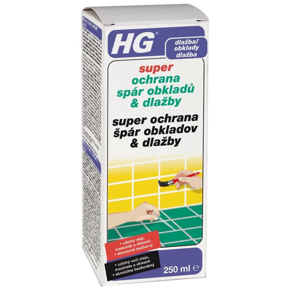Cementové spáry mají stukturovaný povrch, a proto se mohou velmi rychle zanést mastnotou, nečistotou a vápenatými usazeninami a různými skvrnami, které se dají pouze těžko odstranit. Spáry vystavené vlhku a teplu mohou být náchylné na vznik plísní a vodního kamene, čímž dochází k znehodnocování vzhledu koupelny. HG Super ochrana spár obkladů a dlažby řeší tento problém jednoduchým způsobem. Díky čisticímu prostředku HG Super ochrana spár obkladů a dlažby jsou spáry naimpregnované a absolutně odolné vůči vodě, oleji, mastnotě a nečistotám. Podlahy v sprchách se mohou používat po 8 hodinách od aplikace přípravku. 250 ml přípravku HG Super ochrana spár obkladů a dlažby vystačí na plochu cca 30-40 m2.