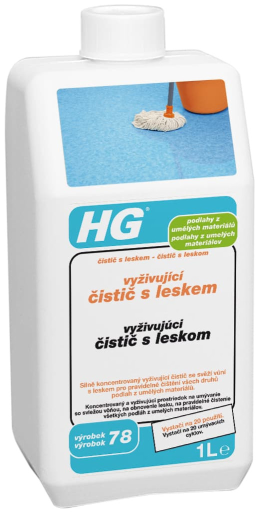HG vyživující čistič s leskem (čistič s leskem) je silně koncentrovaný vyživující čistič se svěží vůní s leskem pro pravidelné čištění všech druhů podlah z umělých materiálů.