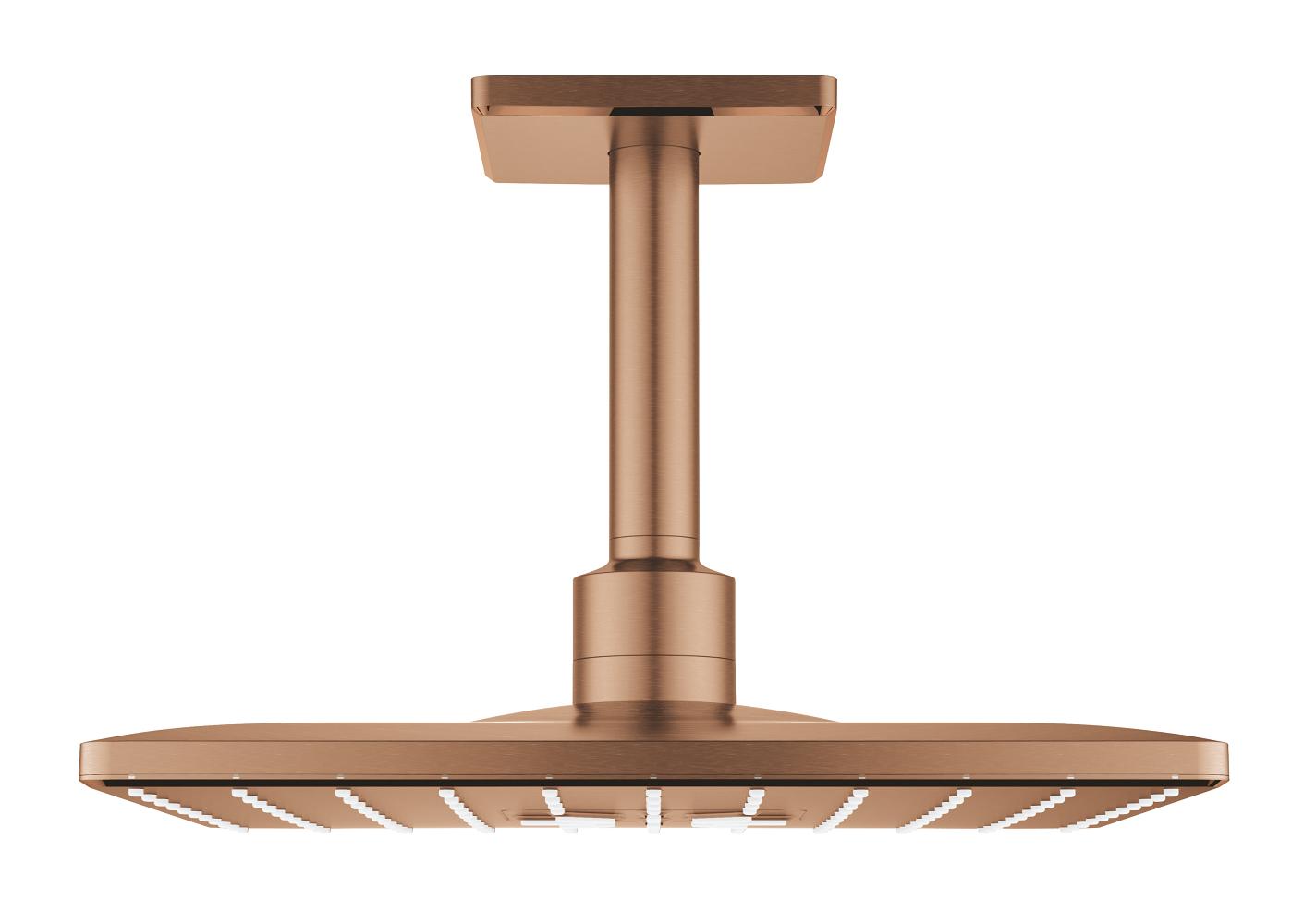 Set hlavové sprchy GROHE Rainshower 310 SmartActive CUBE se 2 režimy proudu vody. 310mm, stropní hlavová sprcha se 142mm sprchovým ramenem, povrchová úprava kartáčovaný Warm Sunset, hranatý tvar. 26481DL0