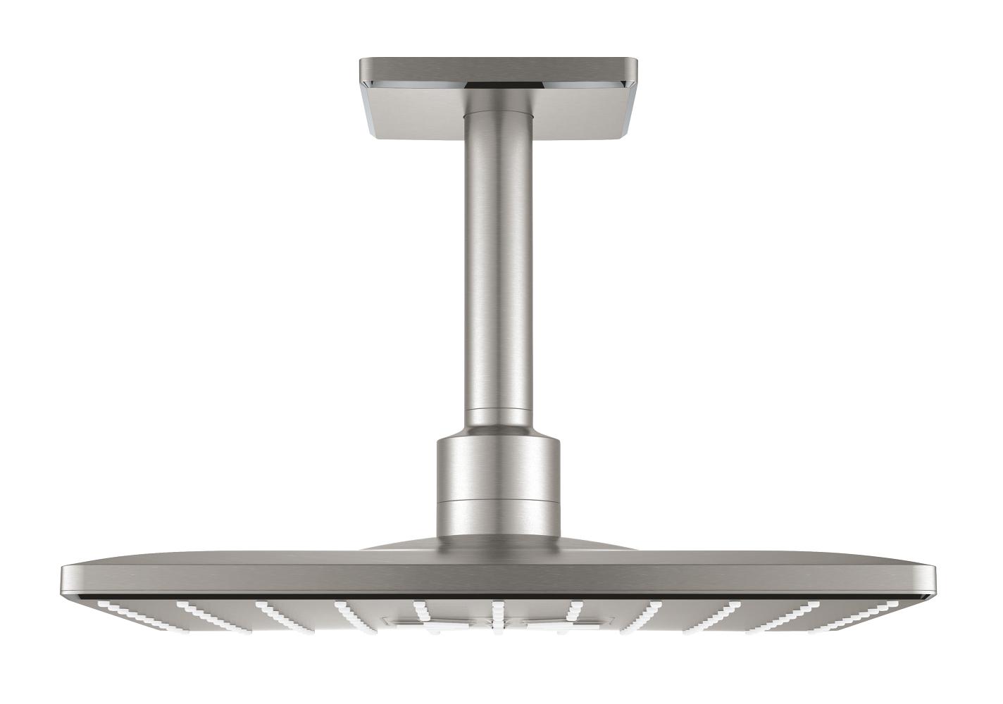 Set hlavové sprchy GROHE Rainshower 310 SmartActive CUBE se 2 režimy proudu vody. 310mm, stropní hlavová sprcha se 142mm sprchovým ramenem, povrchová úprava z nerezové oceli, hranatý tvar. 26481AL0