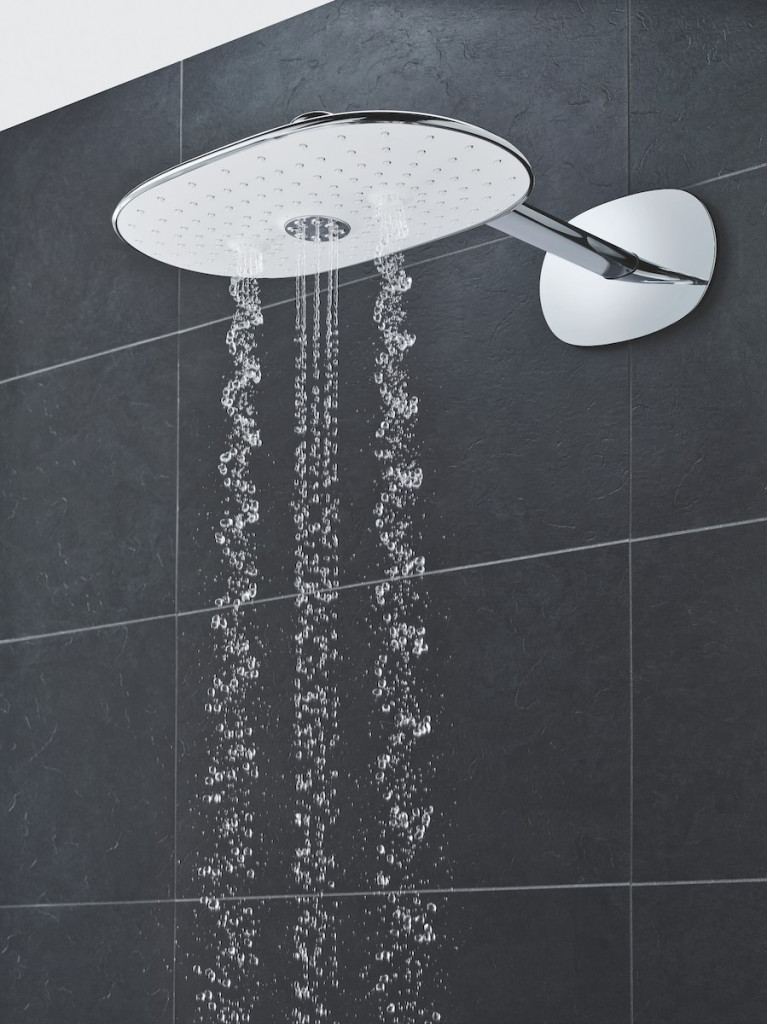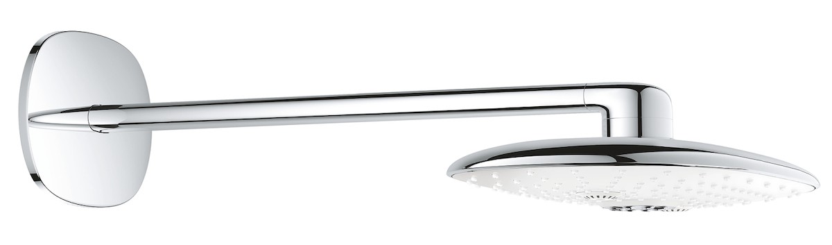 Set hlavové sprchy GROHE Rainshower 360 DUO. Vyrobeno v Německu: 360mm hlavová sprcha (bílý sprchový disk) s režimem proudu GROHE TrioMassage a 450mm sprchové rameno.