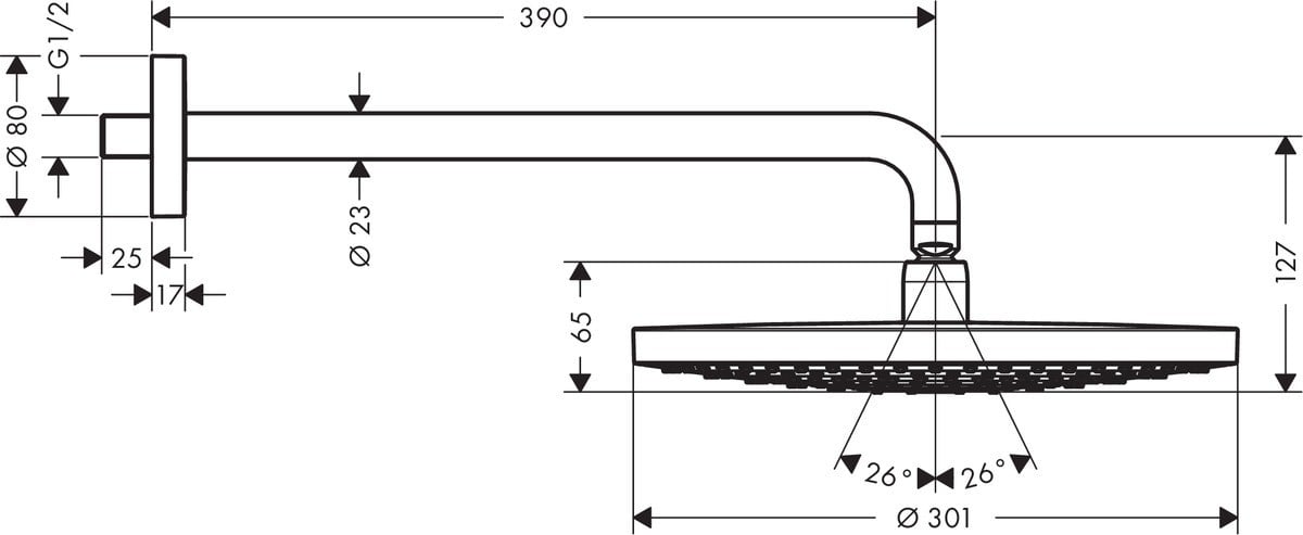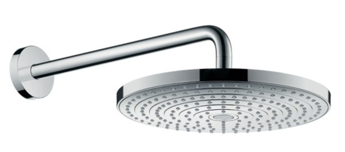 Horní sprcha hansgrohe Raindance Select S 300 2jet je se svým dlouhým sprchovým ramenem (390 mm) ideální k bezproblémové modernizaci velkých sprchových koutů. Lze ji namontovat na stěnu. Velkoformátová sprchová hlavice zajistí vysněný požitek ze sprchování se 2 typy proudu, které zahalí tělo širokým deštěm. Oživující proud Rain osvěžuje, uklidňující proud RainAir hýčká svými bohatými provzdušněnými kapkami. Přepínání tlačítkem Select: To je umístěno uprostřed disku vodních paprsků. Kulový kloub umožňuje nastavit úhel sprchové hlavice.