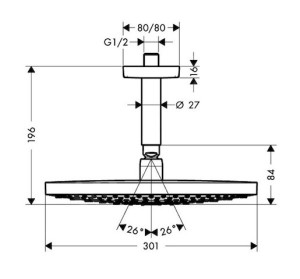Delší dobu jako nové: Vodní kámen lze odstranit jednoduchým otřením silikonových trysek sprchové hlavice (QuickClean)Fascinující vzhled: Brilantní chromový povrch se snadným čištěním přesvědčí trvalým leskemKvalita firmy hansgrohe: Kovový disk vodních paprsků lze navíc kvůli čištění sejmout.Snadná instalace: Přívod od stropu pasuje na standardní vývod vody (velikost G ½; DN15).Potěšení ze sprchování: Sprchová hlavice o velikosti 300 mm vás bude hýčkat rovnoměrným, bohatým proudem vody (XXL-Performance).2 typy dešťových proudů: Rain a RainAir (s AirPower)Potěšení ze sprchování stisknutím tlačítka: Jednoduché a pohodlné přepínání typu proudů tlačítkem (Select)Jednoduché čištění: Vodní kámen lze odstranit lehkým otřením silikonových trysek sprchové hlavice (QuickClean).Instalace na strop s délkou přívodů 100 mm – ideální také do menších sprchových koutůMontáž bez komplikací, je možné využít stávající přípojky.Všechny součásti jsou vyrobeny z vysoce kvalitních materiálů – pro větší bezpečnost a dlouhodobé užívání v domácnosti.Prodloužená pětiletá záruka* na produkt, vyrobený podle nejvyšších kvalitativních standardů *(viz www.hansgrohe.cz/zaruka)Historie hansgrohe od roku 1901 – prémiová značka výrobků pro koupelnu a kuchyňRozměry (Š × H × V): 350 × 474 × 1186 mmŘada hansgrohe Raindance představuje spojení vynikajícího designu a vysoké kvality výrobků, které pozvednou koupelnu na vyšší úroveň.Potěšení ze sprchování: Sprchová hlavice o velikosti 300 mm vás bude hýčkat rovnoměrným, bohatým proudem vody (XXL-Performance).Typ proudu určuje průtokové množství – max. 17,5 l/min. při volbě sprchového deště RainAir a max. 18 l/min. při výběru proudu Rain (při tlaku 3 bary)Pohodlné přepínání: Požadovaný typ proudu zvolíte snadno a rychle stisknutím tlačítka (Select).Včetně sprchového ramena pro přívod od stropu: Zajišťuje ideální polohu sprchové hlavice (délka: 100 mm)Zářivý lesk: Brilantní chromový povrch se snadno čistí a vyznačuje se trvalým leskem.Jednoduché čištění: Vodní kámen lze odstranit lehkým otřením silikonových trysek sprchové hlavice (QuickClean).Dlouho jako nový: Kovový disk vodních paprsků horní sprchy lze kvůli čištění sejmoutSoučásti dodávky: horní sprcha, přívod od stropu, přívodní vsuvka, upevňovací materiál, montážní návodVšechny součásti jsou vyrobeny z vysoce kvalitních materiálů – pro větší bezpečnost a dlouhodobé užívání v domácnosti.Historie hansgrohe od roku 1901 – prémiová značka výrobků pro koupelnu a kuchyňProdloužená pětiletá záruka* na produkt, vyrobený podle nejvyšších kvalitativních standardů *(viz www.hansgrohe.cz/zaruka)PARAMETRY: