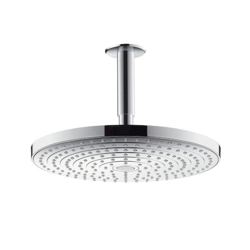 Oby typy proudu se nastavují stisknutím tlačítka Select od hansgrohe přímo na sprchové hlavici (Select). Podle nálady tak máte vždy k dispozici správný sprchový proud. Přívod od stropu (100 mm) přináší dešťovou sprchu do ideální polohy. Protože díky kulovému kloubu lze horní sprchu také nastavit do potřebného úhlu.