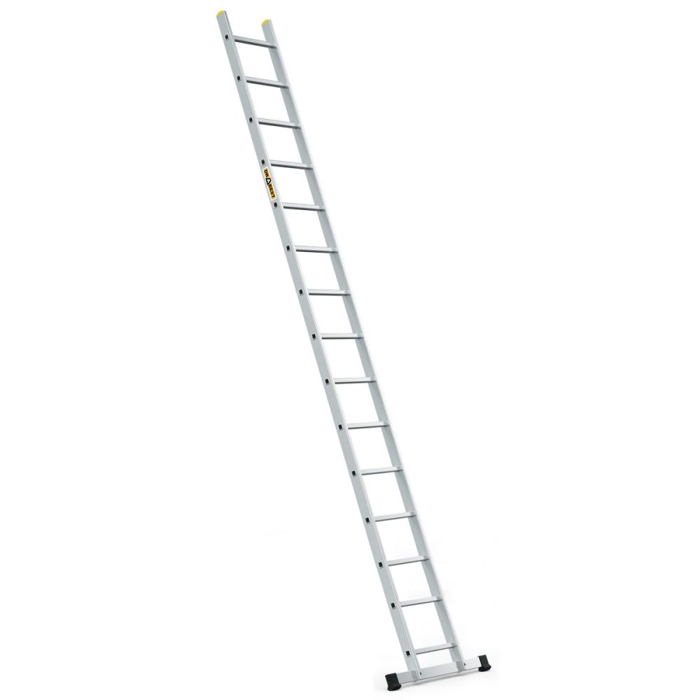 Hliníkový žebřík 1x15 příček jednodílný DRABEST DP-15 PRO je praktický a spolehlivý pomocník pro každodenní práce ve výškách. Díky přídavnému stabilizátoru je vysoce stabilní a snadno použitelný jako přístavný nebo opěrný žebřík. Jeho lehkost a odolnost oceníte zejména při snadné manipulaci. Ať už ho využíváte v domácnosti, na zahradě nebo při profesionálních pracích. S délkou 15 příček poskytuje dostatečnou výšku pro širokou škálu úkolů.