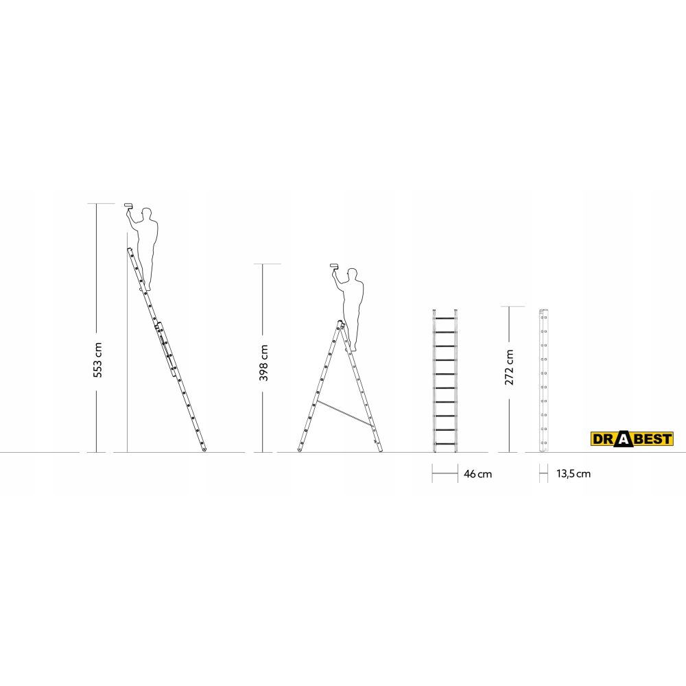 Profesionální víceúčelový žebřík se stabilizátorem, 2x10 příček, délka žebříku 4,32 m, max. pracovní výška 5,53 m, nosnost 150 kg. Certifikace TÜV Rheinland, EN 131 pro profi použití.