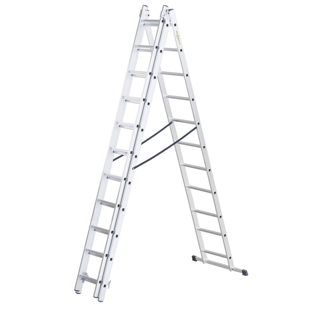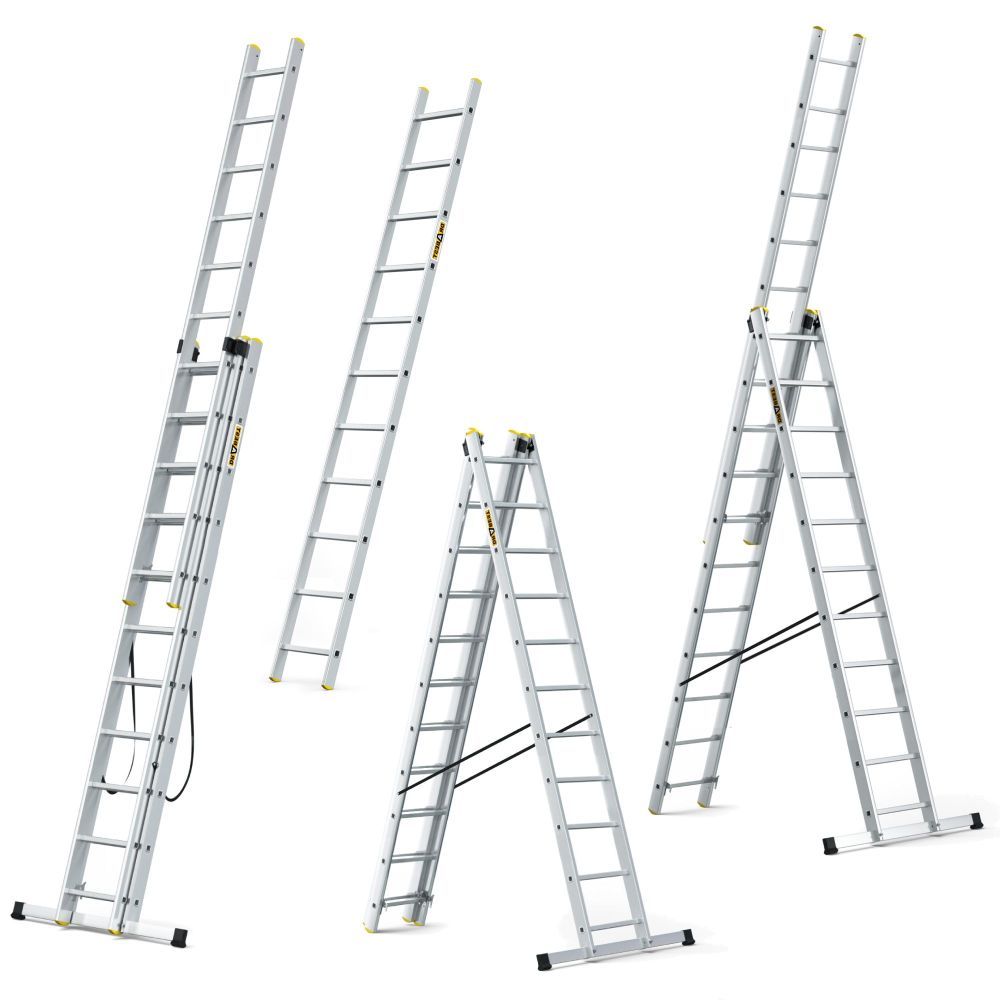 Víceúčelový hliníkový žebřík se stabilizátorem, 3x11 příček, max. pracovní výška 6,55 m, nosnost 150 kg. Certifikace TÜV Rheinland, EN 131 pro domácí použití.