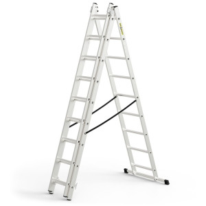 Víceúčelový hliníkový žebřík se stabilizátorem, 3x9 příček, max. pracovní výška 5,47 m, nosnost 150 kg. Certifikace TÜV Rheinland, EN 131 pro domácí použití.
