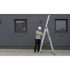 Profesionální víceúčelový žebřík se stabilizátorem, 3x9 příček, max. pracovní výška 5,84 m, nosnost 150 kg. Certifikace TÜV Rheinland, EN 131 pro profi použití.