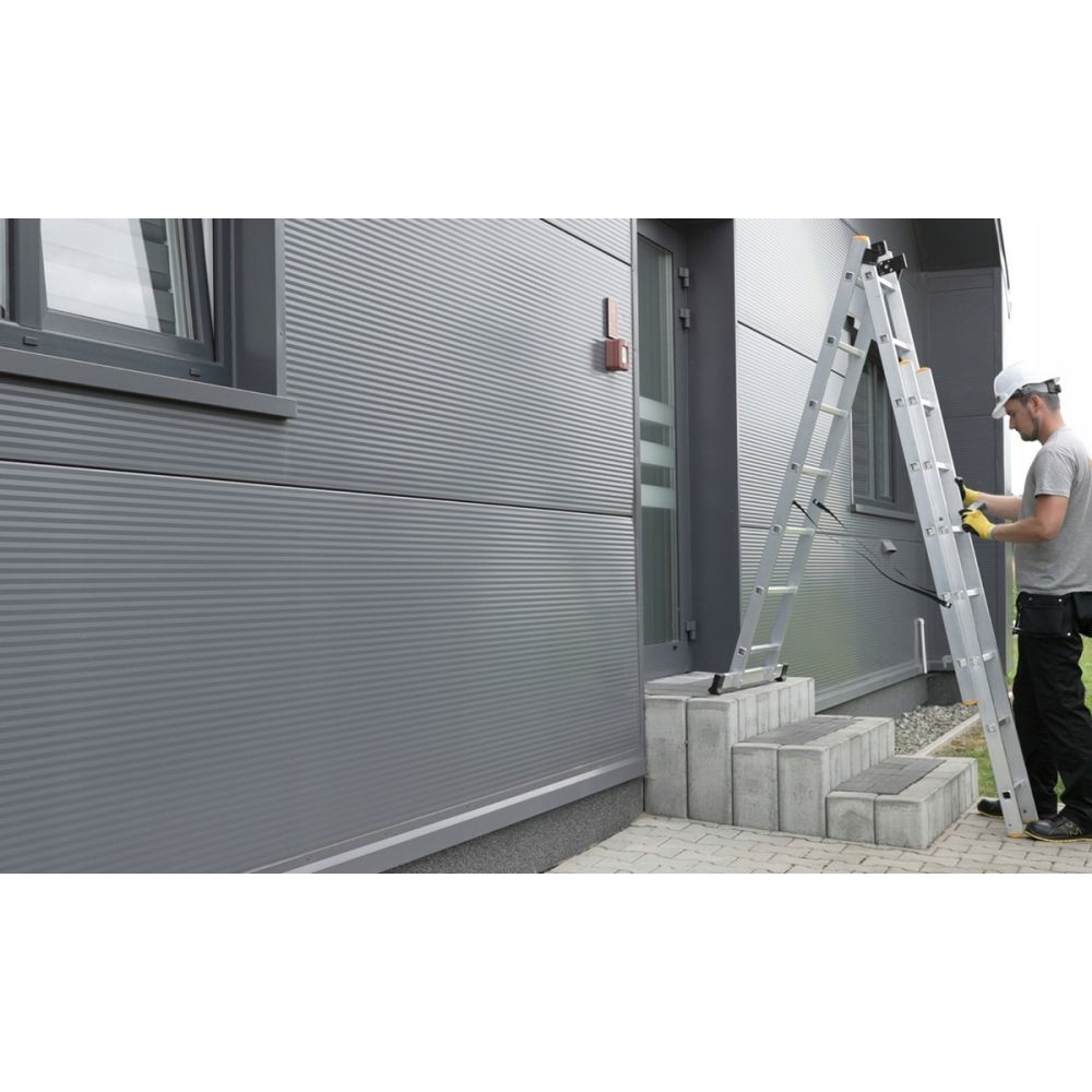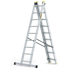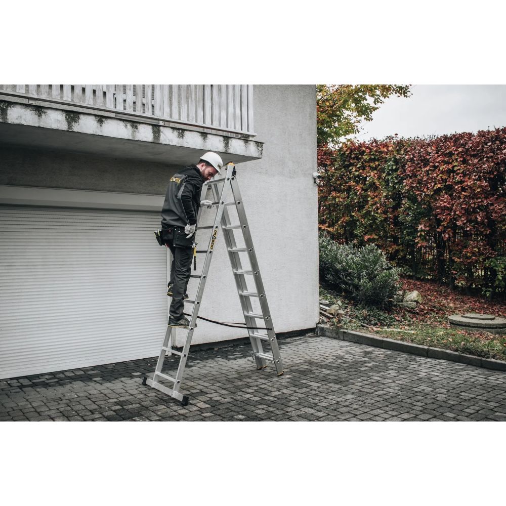 Dotaz na produkt Na splátky ještě dnesProfesionální víceúčelový žebřík se stabilizátorem, 3x9 příček, max. pracovní výška 5,84 m, nosnost 150 kg. Certifikace TÜV Rheinland, EN 131 pro profi použití.