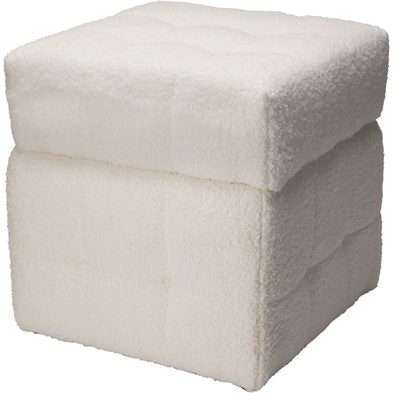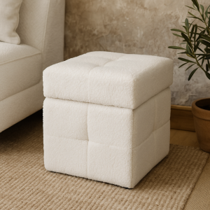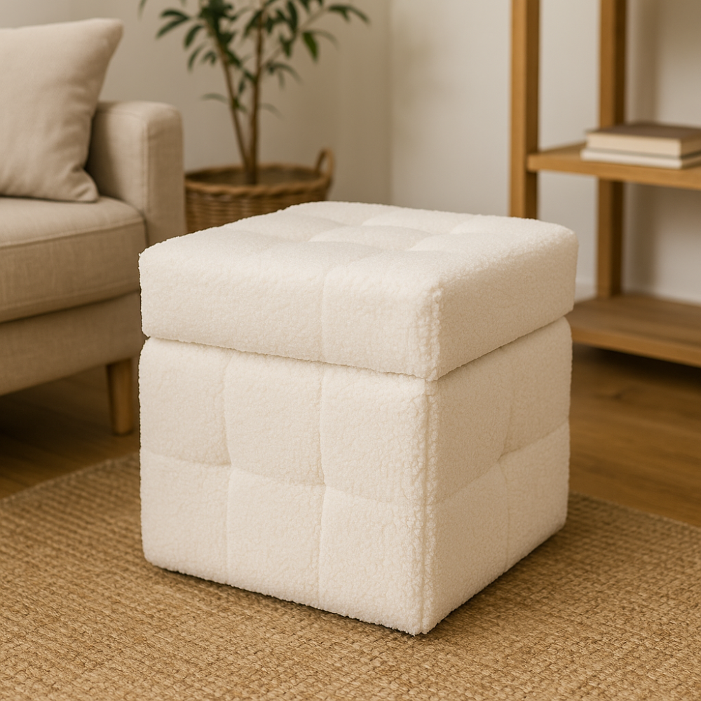 Praktický taburets úložným prostorem, vyrobený z kombinace MDF, překližky a měkkého materiálu Teddy, vhodný pro uložení hraček nebo drobných předmětů.