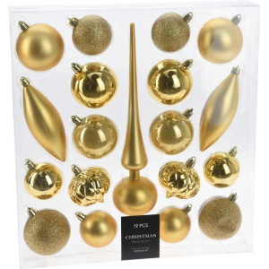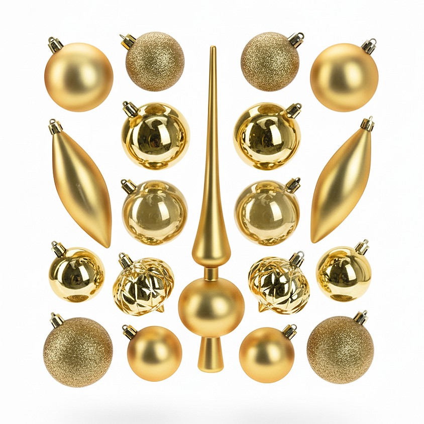 Tato elegantní sada vánočních ozdob v zlaté barvě je ideální pro ozdobení vašeho vánočního stromku. Díky různým tvarům a povrchovým úpravám přidá vašemu stromku styl a lesk.