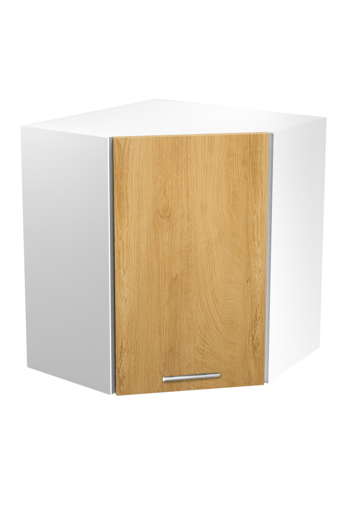Horní rohová skříňka Vento G60-72. Vyrobena z laminované desky v barvě bílá, béžová a šedá.