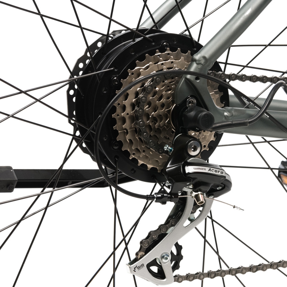 O pohon se stará zadní nábojový motor Bafang s výkonem 250 W a točivým momentem 45 Nm, který je napájen integrovanou baterií – dojezd tak má až 100 km. Plynulé řazení zajišťuje 9rychlostní sada Shimano Altus s páčkovým ovládáním, která ti umožní bez námahy zvládnout jak stoupání, tak svižné rovinky.