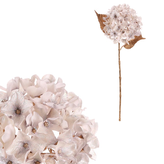 Dotaz na produktUmělá hortenzie s bílým květem, pozlacenými listy a jemným třpytem, přináší do interiéru tu pravou sváteční eleganci. Skvěle se hodí jako vánoční dekorace, ať už samostatně, nebo jako součást větších kytic. Velkou výhodou je, že zůstane krásná napořád bez jakékoli péče.