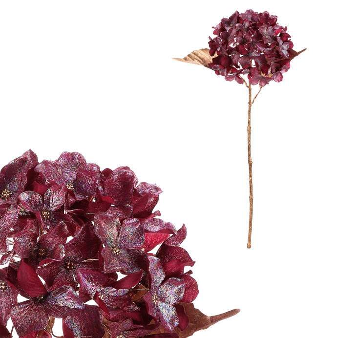 Dotaz na produktUmělá hortenzie v tmavě červeném odstínu s pozlacenými listy a jemným třpytem, přináší do interiéru tu pravou sváteční eleganci. Skvěle se hodí jako vánoční dekorace, ať už samostatně, nebo jako součást větších kytic. Velkou výhodou je, že zůstane krásná napořád bez jakékoli péče.