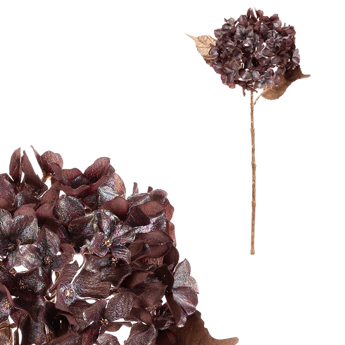 Dotaz na produktUmělá hortenzie v hnědém odstínu s pozlacenými listy a jemným třpytem, přináší do interiéru tu pravou sváteční eleganci. Skvěle se hodí jako vánoční dekorace, ať už samostatně, nebo jako součást větších kytic. Velkou výhodou je, že zůstane krásná napořád bez jakékoli péče.