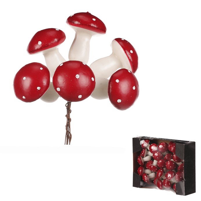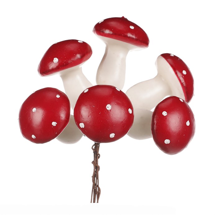 Drobné a lehké plastové houby na drátku jsou všestrannými ozdobami pro vytváření především podzimních aranží. Mají červenou barvu kloboučků s bílými puntíky přípomínající mochomůrky červené a balené...