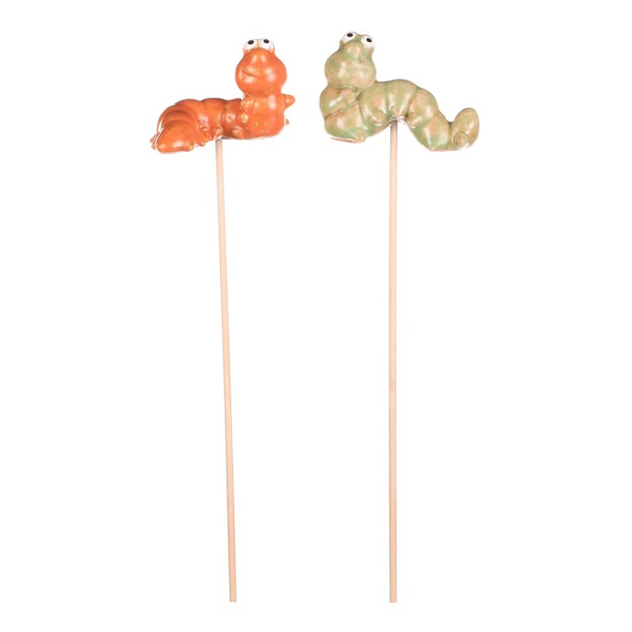 Dotaz na produktKeramická housenka na dřevěné špejli v oranžovém a zeleném provedení přináší hravý dekorativní prvek vhodný pro ozdobení květináčů, zahradních aranžmá nebo interiérových květin. Každý kus je ručně tvarovaný s důrazem na detail, což dodává výrobku jedinečný charakter. Dlouhá dřevěná špejle umožňuje snadné zapíchnutí do zeminy či substrátu a stabilní držení. Housenka je ideální pro vytvoření veselého a přírodního vzhledu v domácnostech i na zahradách. Cena je uvedena za jeden kus, dodávaný v mixu dvou barevných variant.