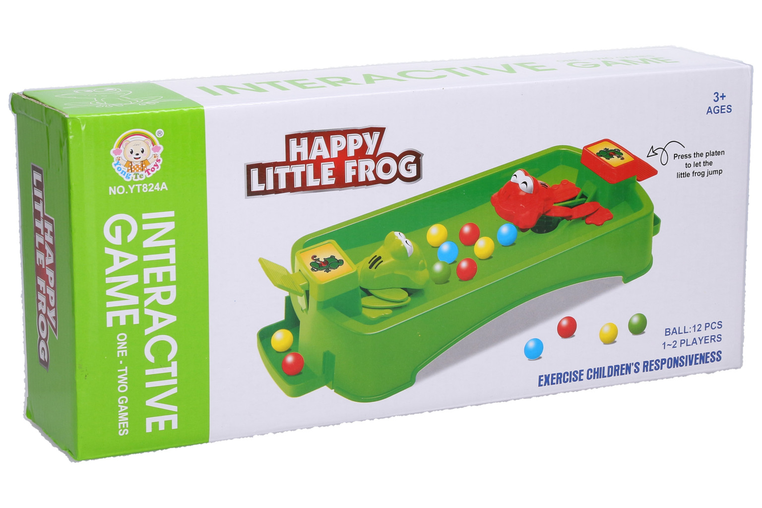 Dotaz na produktHra skákající žabky. Velikost 35 cm. Hra pro 2 hráče. Zmáčknutím páčky na kraji žabka vyskočí a sní kuličku. Kulička spadne do důlku a vyjede pod páčkou ven. Která žabka sní víc kuliček, vyhrává. Obsahuje 12 kuliček.