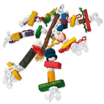 Dotaz na produktZávěsná dřevěná hračka s provazy vhodná pro malé a střední exotické ptactvo. Z přírodních materiálů.