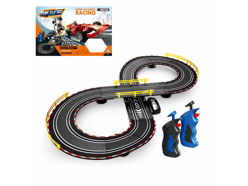 Dotaz na produktHračka pro malé závodníky nabízí zábavnou autodráhu ve tvaru osmičky o rozměrech 100 × 48 × 9 cm. Díky napájení přes adaptér se děti mohou pustit do akce bez časté výměny baterií. Ideální zábava pro kluky i holky od 6 let.