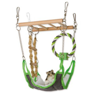Dotaz na produktZávěsný žebřík s pelíškem a bavlněným kruhem sloužící jako místo pro odpočinek malých hlodavců.