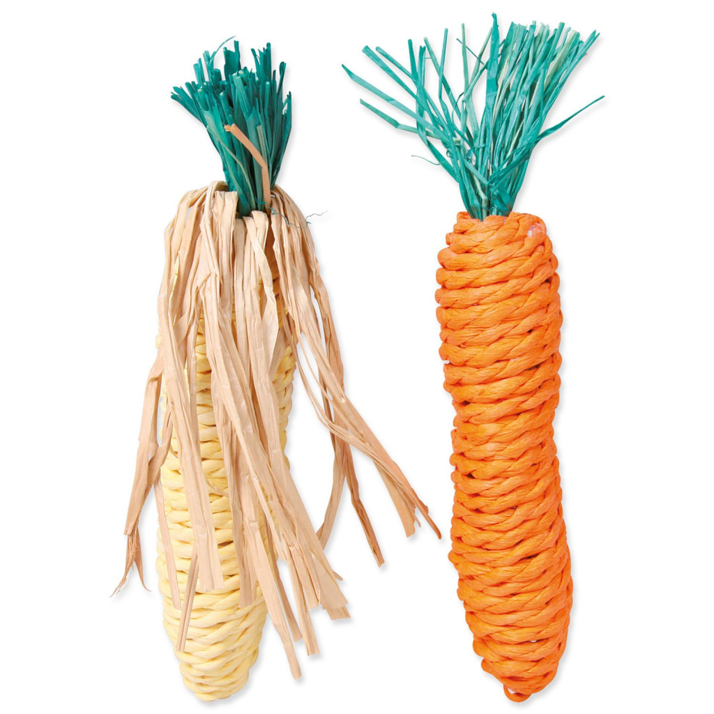 Dotaz na produktHračka pro králíky a drobné hlodavce slaměná mrkev a kukuřice.