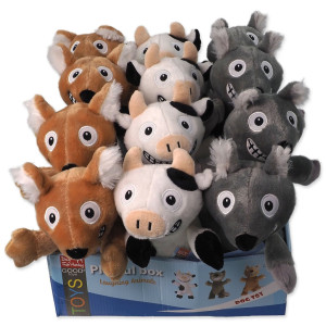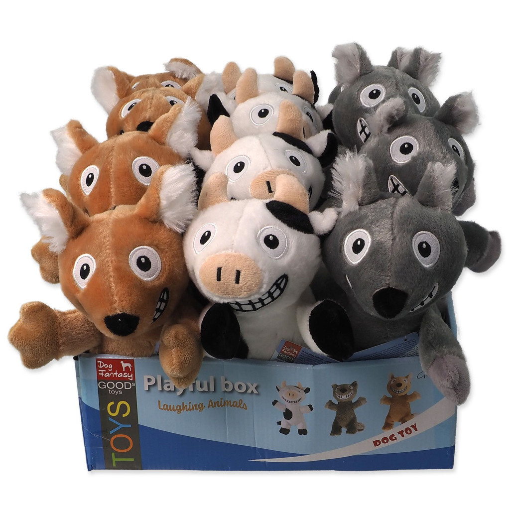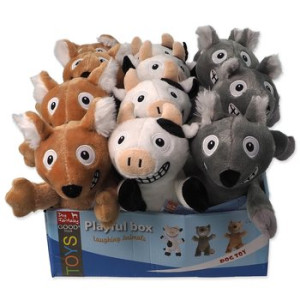 Box 18 ks pískacích a šustících hraček Dog Fantasy Playful Box Laughing ve tvaru zvířátek (29 cm). Mix barev a tvarů.