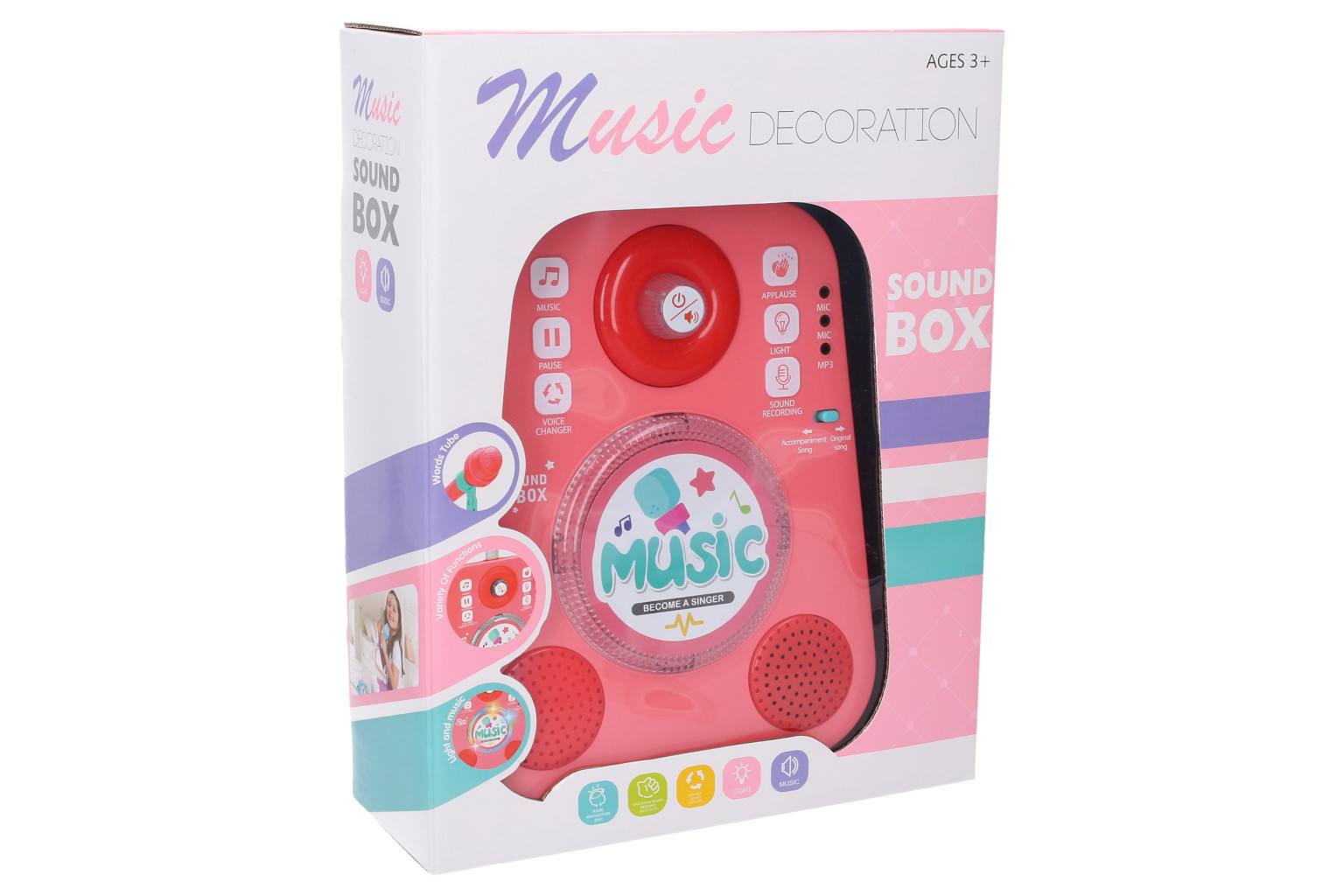 Dotaz na produktHudební box s mikrofonem v růžové barvě je skvělým dárkem pro každého hudebníka. Rozměry 19x8,5x92 cm. Funkce nahrávání, změna hlasu, aplaus, karaoke, připojení zdroje mp3, nastavitelná výška mikrofonu. Světelné a zvukové efekty. 3xAA baterie nejsou součástí. Doporučený věk: 3+