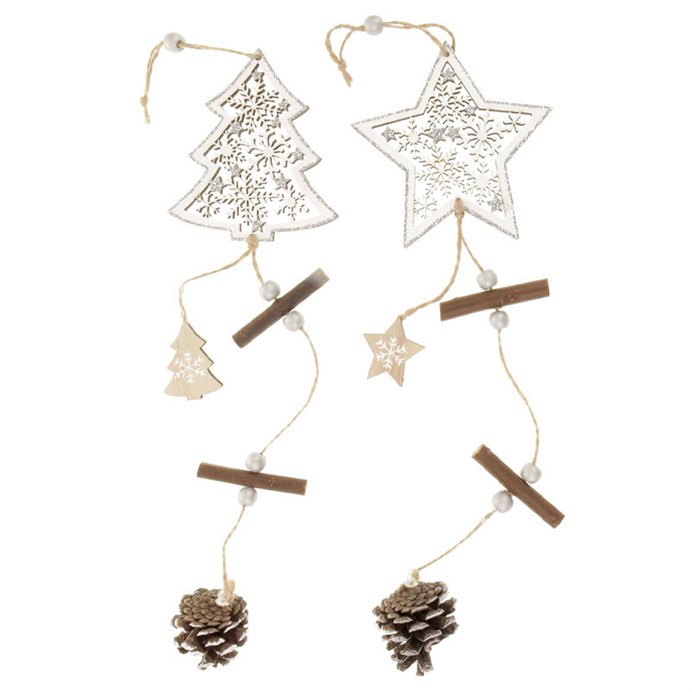 Dotaz na produktKrásnou dřevěnou dekorací vytvoříte v interiéru kouzelnou vánoční atmosféru.Jedná se o ozdobnou hvězdičku nebo stromeček na pověšení ve formě kratších girland. Na konci každé z nich je jedna drobná borovicová šiška.