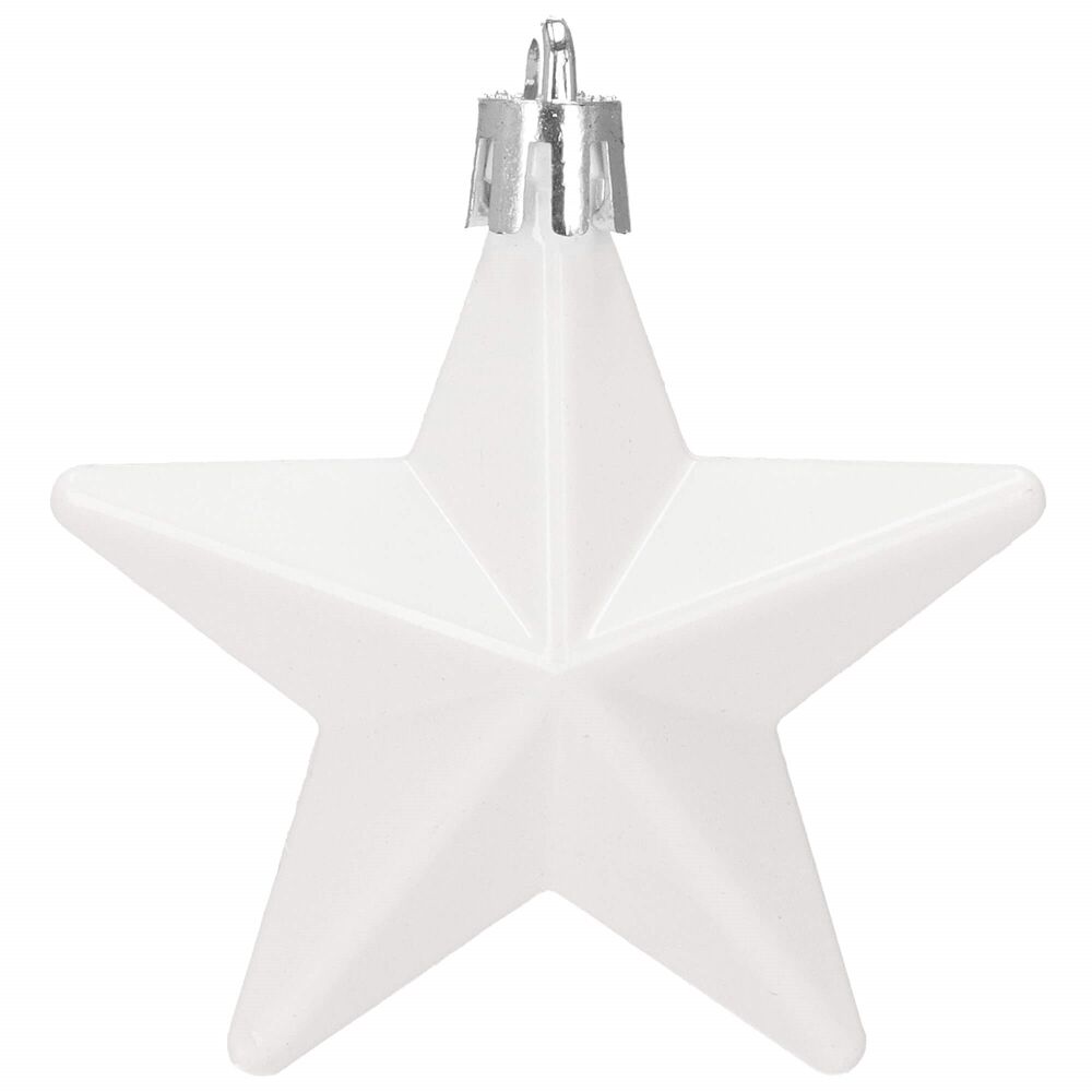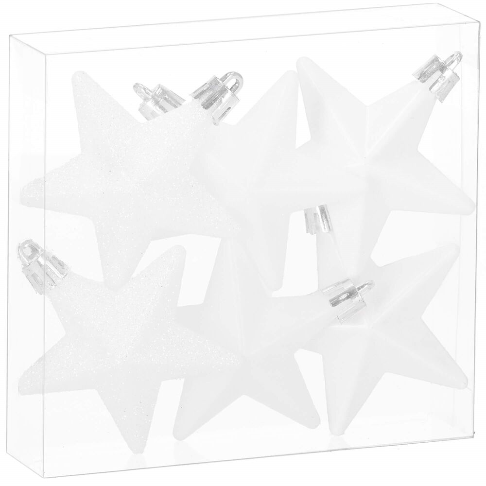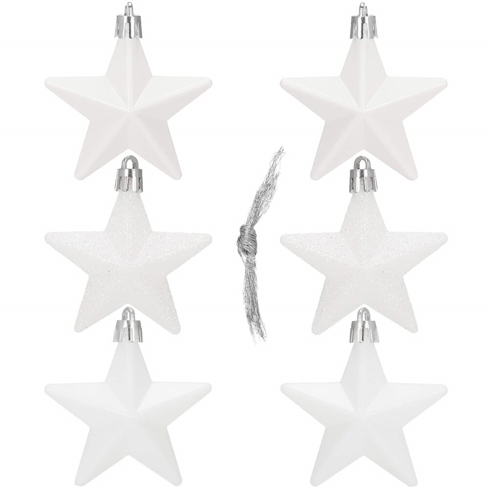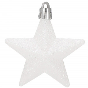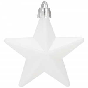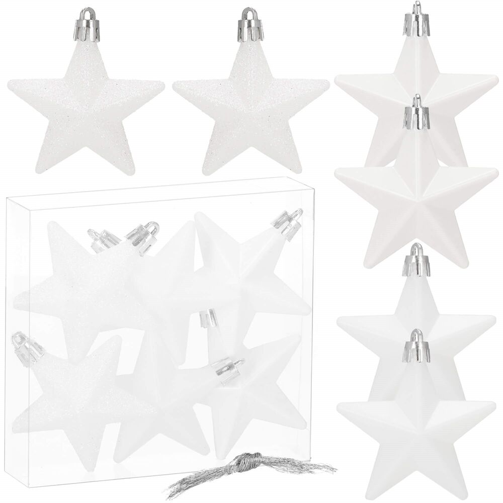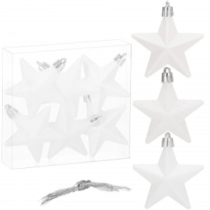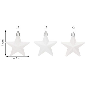 Sada vánočních ozdob ve tvaru hvězd v bílém provedení dodá vaší výzdobě jemný a elegantní vzhled. Ideální jako dekorace na vánoční stromeček, sváteční stůl nebo do oken. Vyrobeny z nerozbitného plastového materiálu, vhodné pro vnitřní i venkovní použití. Součástí balení jsou poutka pro zavěšení. Průměr 6,5 cm, celkem 6 kusů v sadě.