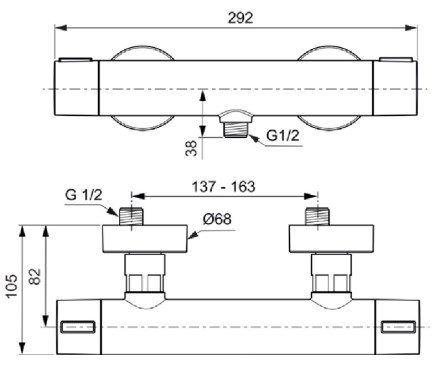 šířka 292 mmrozteč 150 mmpřipojení G 1/2"materiál kovbarva rosé (růžové zlato)ovládání kohoutkyse zařízením na zamezení zpětného tokustandardní S-přípojkytermostatická IS kartušerukojeti s tlačítkem...