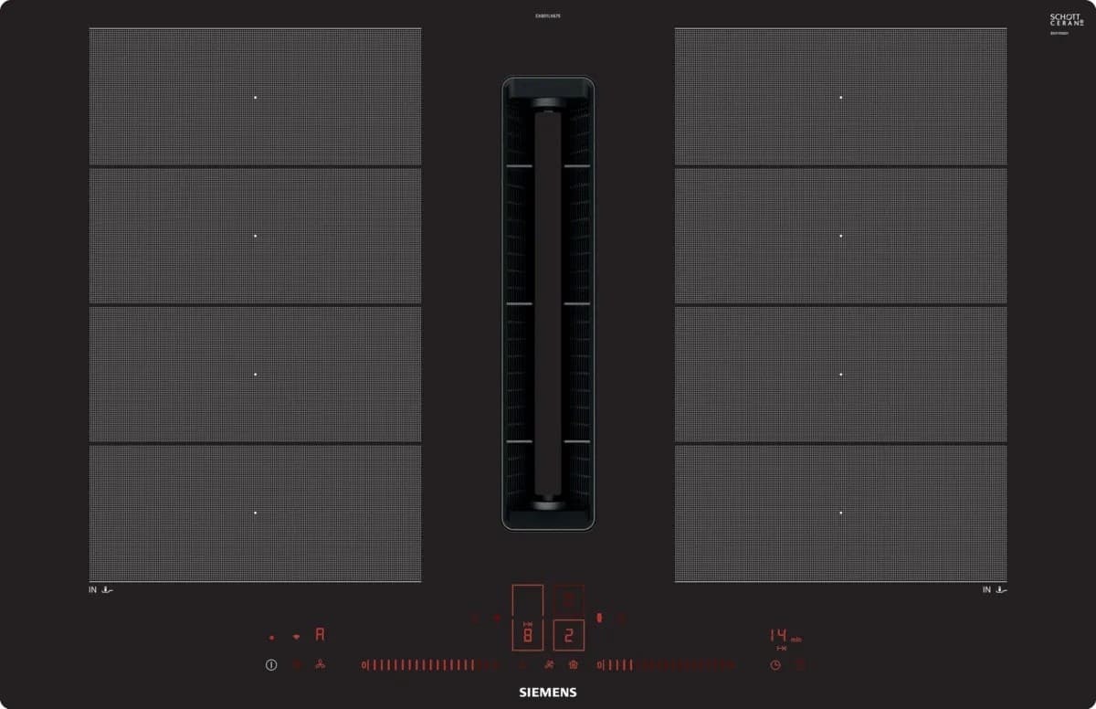 Indukční varná deska Siemens s odsáváním 80 cm zápustný design, instalace do roviny pracovní desky EX801LX67E