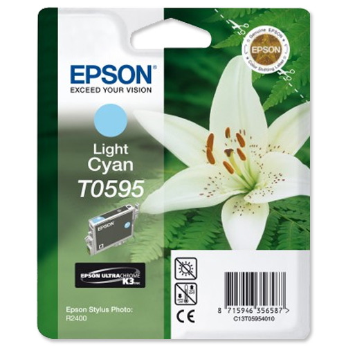 Epson T0595 je inkoustová kazeta světlé azurové barvy, která je určená pro tiskárny Epson R2400. Originální barva poskytuje obsah 13 ml.