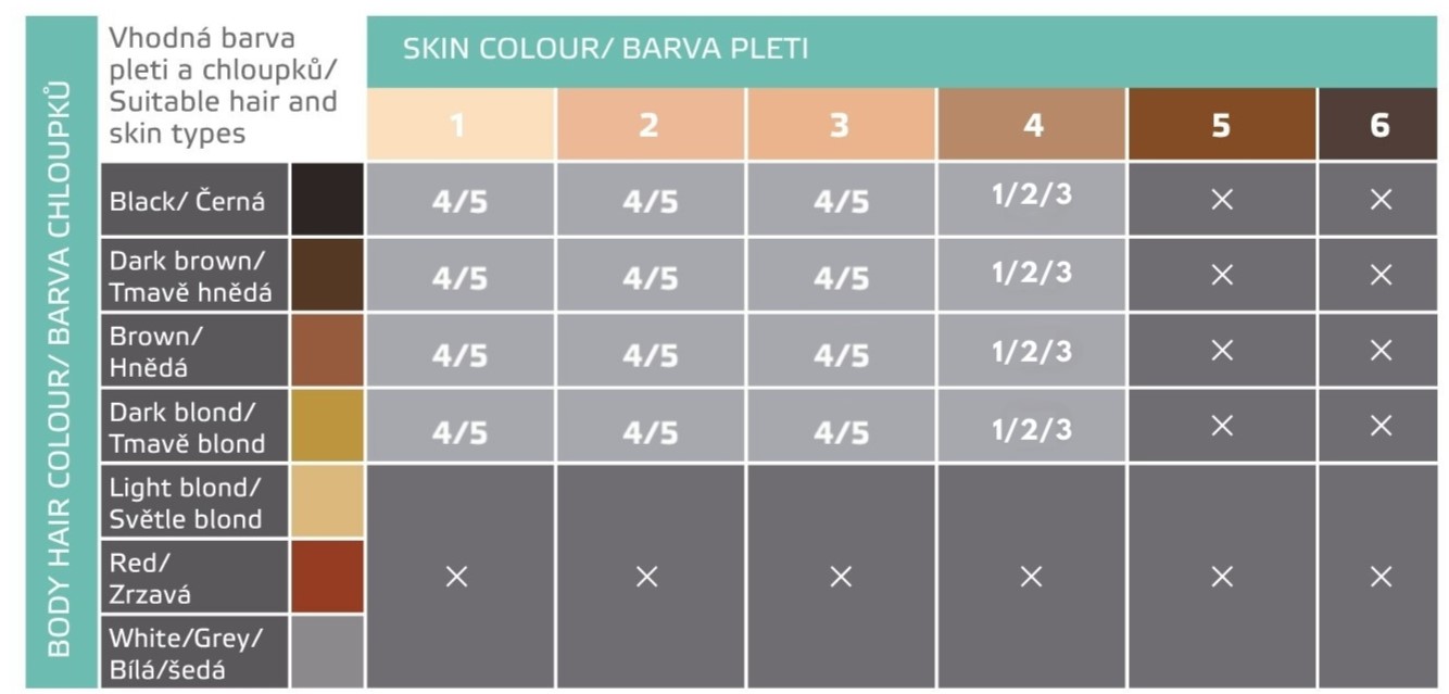 | Plocha depilace | 3 cm² (33 × 9 mm), 2,7 cm² (30 × 9 mm), 2 cm² (22 × 9 mm) |