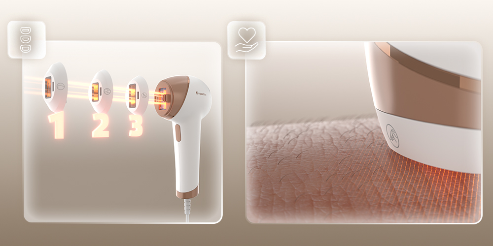 Tři speciální nástavce umožňují cílené ošetření různých oblastí těla. Široká hlavice je určena pro větší plochy, jako jsou nohy, menší precizní adaptér pro obličej se postará o jemné partie, a speciální nástavec pro oblast bikin zajistí šetrné ošetření těch nejcitlivějších míst. Každá část těla tak dostane přesně takovou péči, jakou potřebuje – rychle, pohodlně a bez zbytečného diskomfortu.