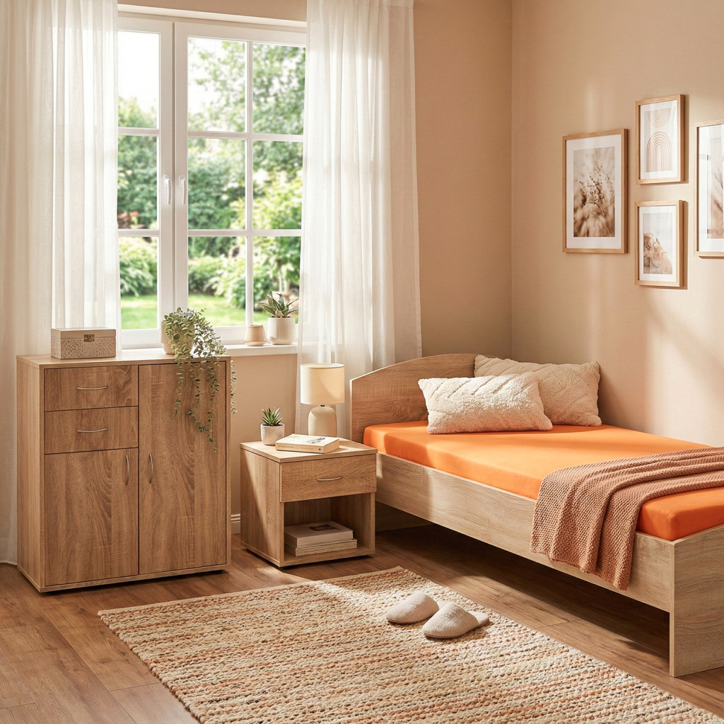 barevné provedení dub Sonoma výška sedu 41 cm, cena bez roštu a matrace doporučený rozměr matrace 90 × 200 cm (M2, M5, M9, M12, M24, M26) a rošt R1 k jednolůžku možno dokoupit úložný prostor 147A