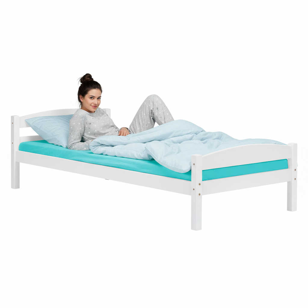 Postel je vyrobená z kvalitních nábytkových materiálů (běžně se používá dřevo/masiv, MDF nebo laminovaná deska – dle konkrétní specifikace výrobce) a opatřená vysoce kvalitním bílým lakem. Ten vytváří hladký, odolný povrch, který se dobře čistí a lépe odolává běžnému opotřebení v domácnosti. Design stojí na čistých liniích a jednoduchém tvaru, díky čemuž jednolůžko nepůsobí robustně a hodí se i do menších pokojů.