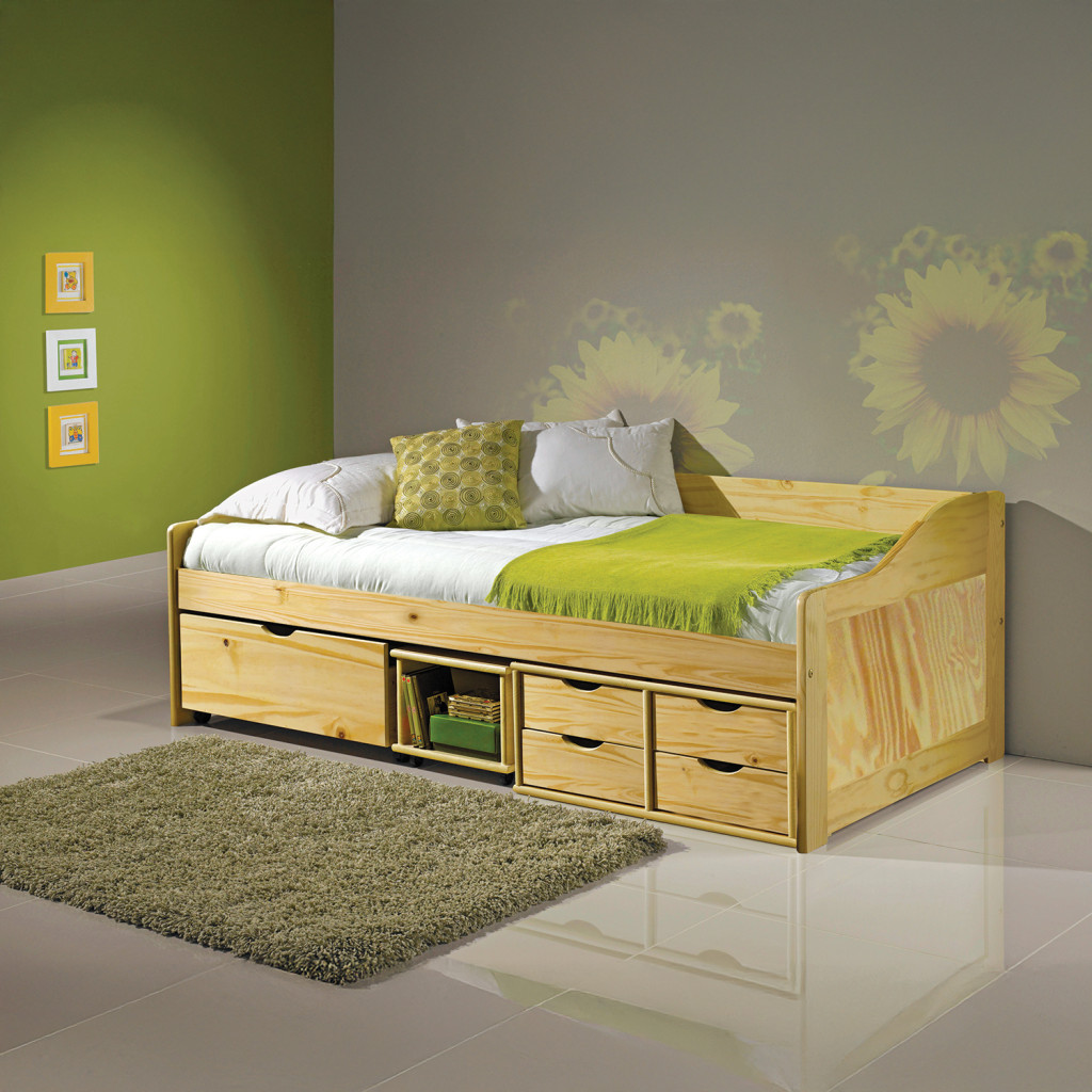 materiál masiv borovice, lakované provedení praktické úložné prostory pod postelí (zásuvky a otevřená police) v ceně výška sedu 50 cm, cena včetně roštu (dřevěný laťkový), matrace není v ceně doporučený rozměr matrace 90 × 200 cm (M2, M5, M9, M12, M24, M26) jako vhodný doplněk doporučujeme čalouněný válec M10 hloubka široké zásuvky 65,5 cm, hloubka malých zásuvek 39 cm, hloubka otevřené police 44,5 cm