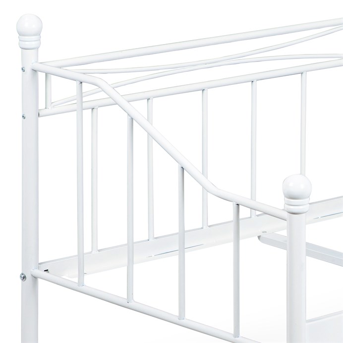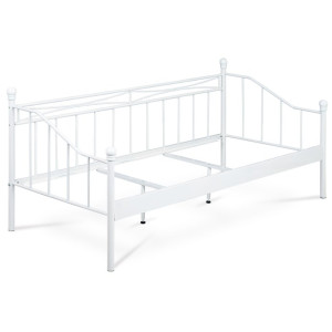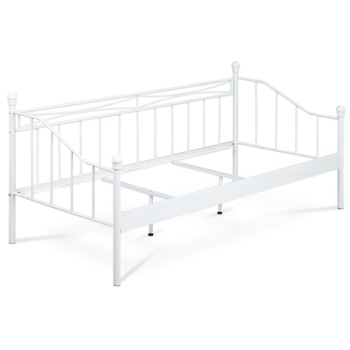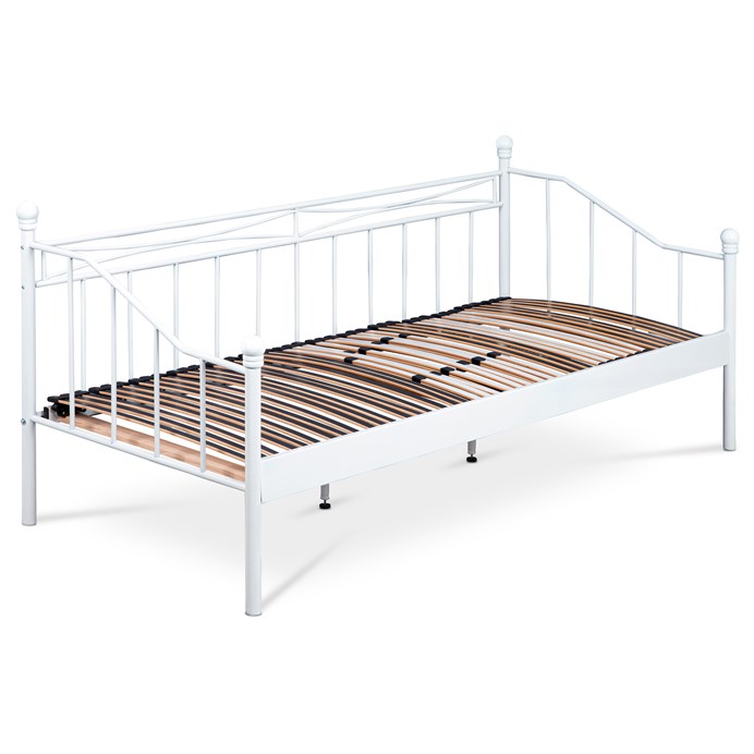 Jednolůžková postel o rozměru lůžka 90x200 cm je vyrobena z pevného kovu s matnou bílou povrchovou úpravou, která zajišťuje odolnost proti poškrábání a snadnou údržbu. Kovová konstrukce je navržena tak, aby poskytovala stabilní a bezpečný rám pro každodenní použití, přičemž její design doplňují dekorativní prvky na čelech a bočnicích. Postel je vybavena pevnou roštovou konstrukcí, která rovnoměrně rozkládá váhu a podporuje kvalitní spánek. Výška rámu umožňuje snadné uskladnění pod postelí, což přispívá k efektivnímu využití prostoru v místnosti. Díky svému jednoduchému a nadčasovému vzhledu se hodí do různých interiérových stylů.