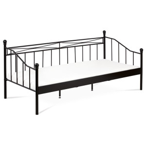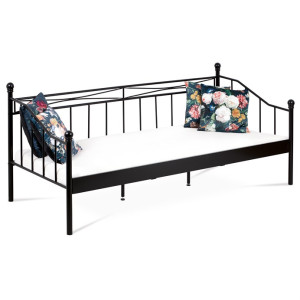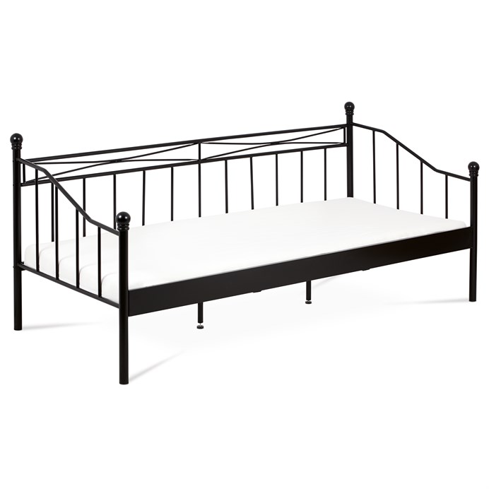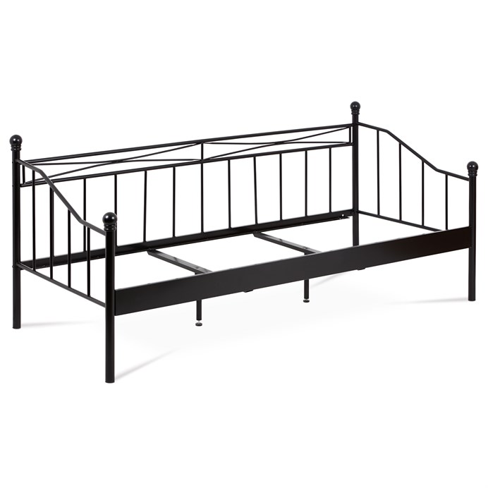 Jednolůžková postel o rozměru 90x200 cm je vyrobena z pevného kovu s matnou černou povrchovou úpravou, která zajišťuje odolnost proti poškrábání a snadnou údržbu. Design rámu kombinuje jednoduché rovné i mírně zakřivené linie s decentními ozdobnými prvky na čelech, což dodává posteli nadčasový vzhled vhodný do různých interiérů. Konstrukce je doplněna o střední podpěrnou nohu pro zvýšení stability a rovnoměrné rozložení váhy matrace. Postel je určena pro matrace o rozměru 90x200 cm a její pevná kovová základna je navržena pro dlouhou životnost a spolehlivost. Díky svému minimalistickému stylu a kvalitnímu zpracování představuje praktickou volbu pro ložnice, studentské pokoje či hostinské místnosti.