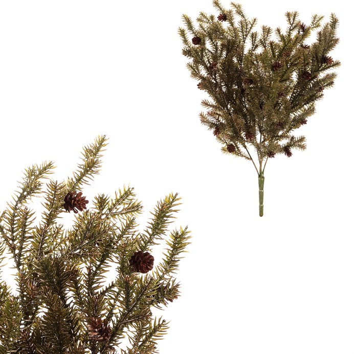 Dotaz na produktUmělá větev s jehličím a šiškami přináší kouzlo zimní přírody přímo k vám domů. Zelené větvičky s jemným zlatým zdobením a drobnými šiškami věrně napodobují jehličnan, připomínající borovici, a přitom vám nikdy neopadá. Ideální pro trvanlivou vánoční výzdobu, ať už ji umístíte samostatně do vázy, nebo využijete jako součást komplexnějších sváteční aranží.