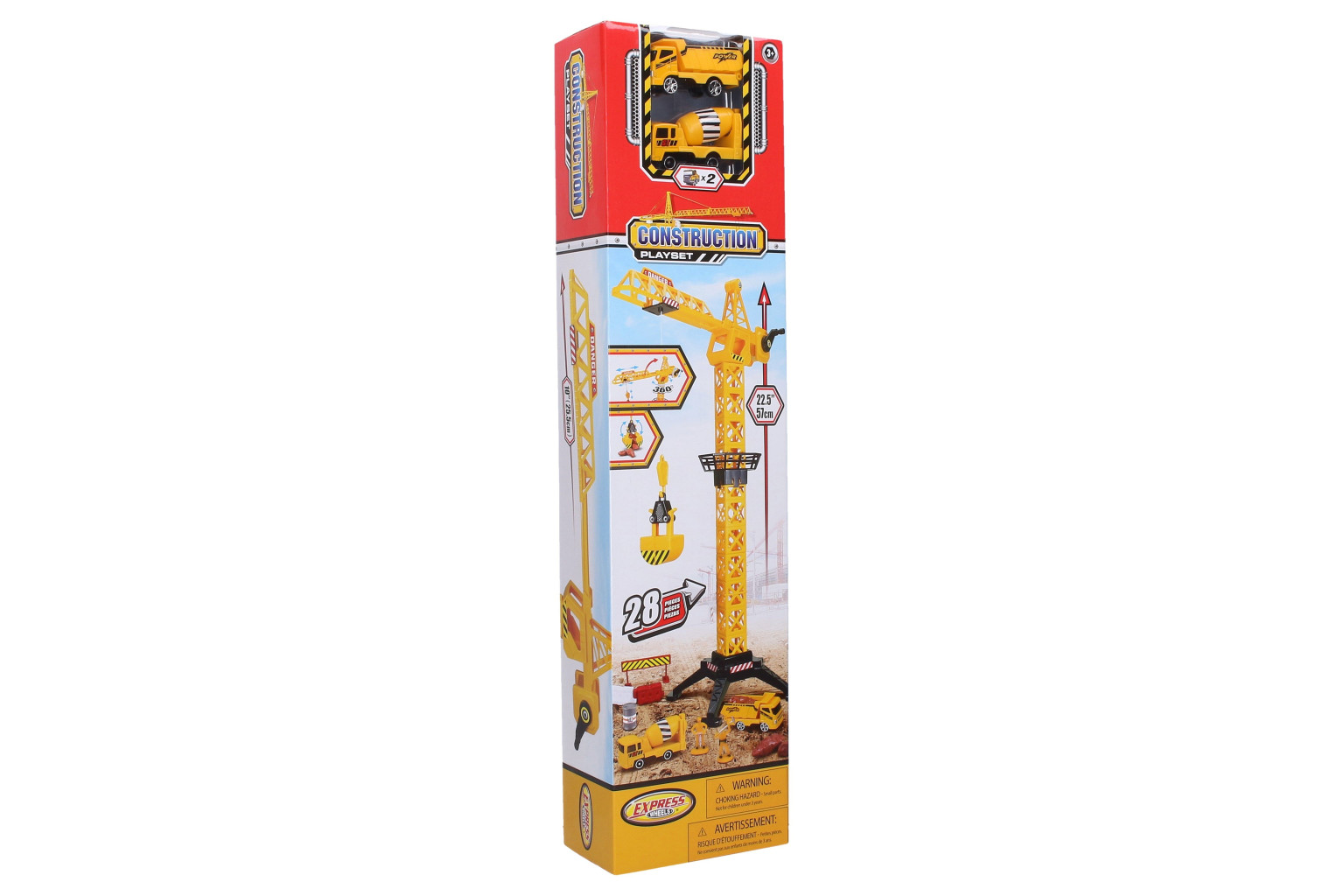 Dotaz na produktJeřáb se 2 stavebními auty. Velikost jeřábu 57 cm. Manuální jeřáb na kliku, otočné rameno o 360 stupňů. Obsahuje jeřáb, 2 stavební auta, 2 figurky stavebníků, 2 barely, 2 závory, stavební materiál a další. Obrázkový návod na složení na zadní straně obalu.