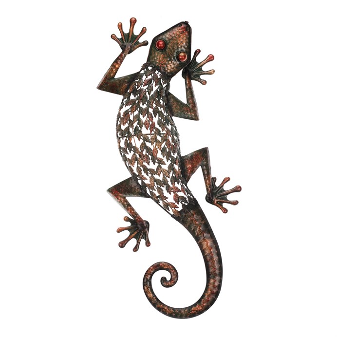 Dotaz na produkt Na splátky ještě dnesKovová závěsná dekorace ve tvaru ještěrky v měděném odstínu přináší do interiéru nebo exteriéru zajímavý vizuální efekt. Detailní zpracování povrchu s perforovaným tělem vytváří hru světla a stínu, která oživí jakoukoliv stěnu. Dekorace je vybavena praktickým háčkem pro snadné zavěšení. Větší rozměry zajišťují výrazný dekorativní prvek vhodný pro různé typy prostor.