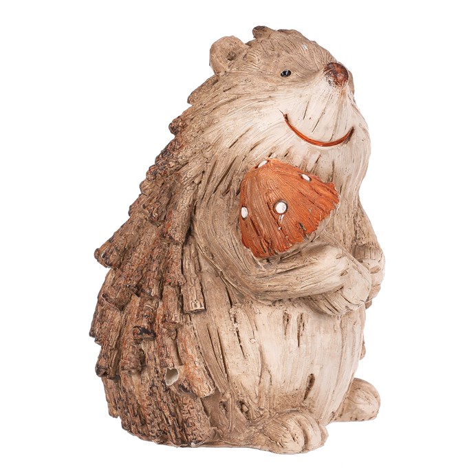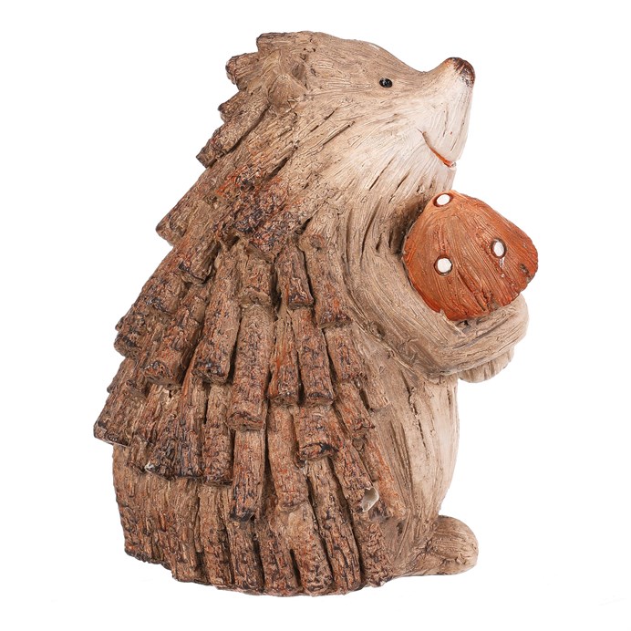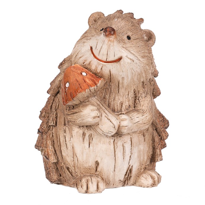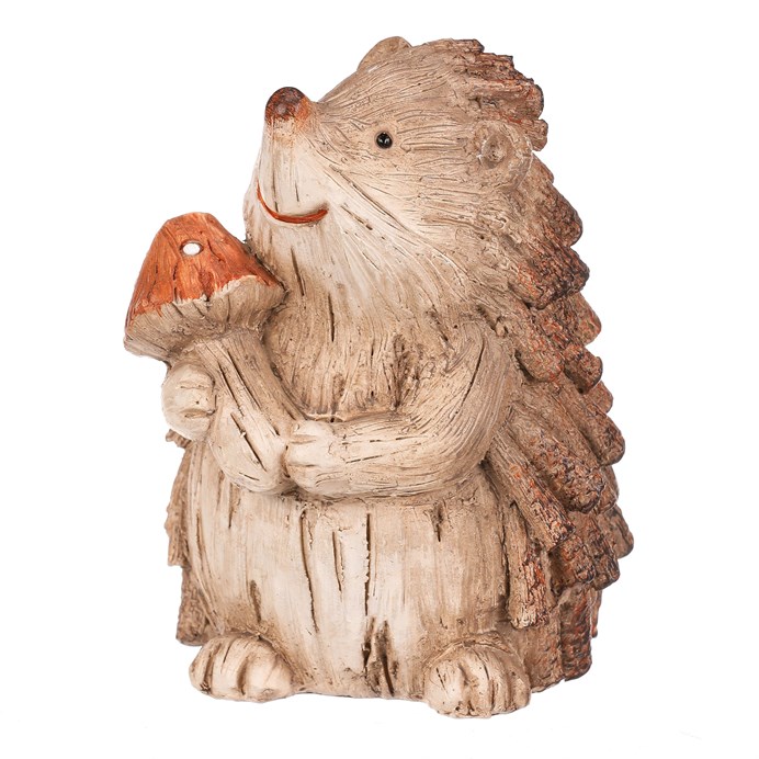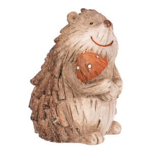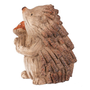 Dotaz na produktZahradní figurka v podobě ježka svým provedením krásně zapadne mezi keře a další dřeviny, čímž vytvoříte pohádkové lesní zátiší. Ježek v béžovo-hnědých odstínech, držící červenou mochomůrku, je vyroben z polyresinu, ale vypadá jako by byl právě ze dřeva. Jeho bodliny jsou tvořeny jakoby drobnými nasekanými částmi větviček a zbytek těla má charakteristickou dřevěnou texturu.