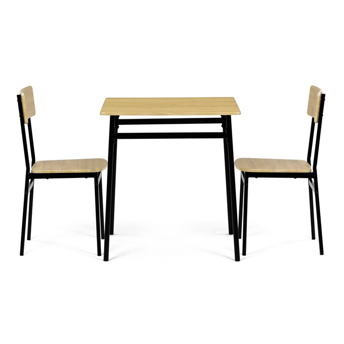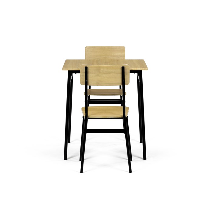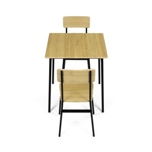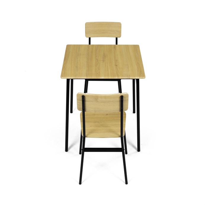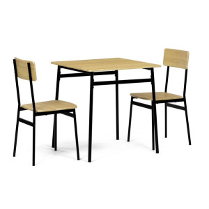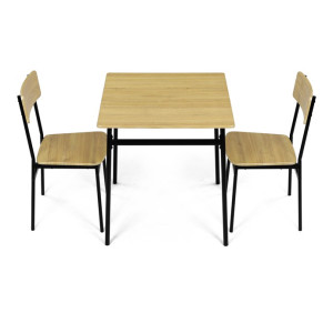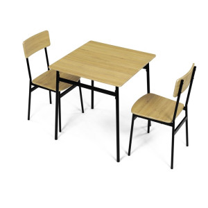 Tento jídelní set značky Autronic je ideální volbou pro menší prostory. Set obsahuje čtvercový stůl a dvě židle, které se svým industriálním designem dokonale hodí do moderních interiérů. Deska stolu i sedáky jsou vyrobeny z odolného MDF s dekorem divokého dubu. Černé kovové nohy dodávají sestavě stabilitu a moderní kontrast. Tento set je ideální pro dvě osoby a je vhodný zejména do menších jídelen nebo kuchyní. Montáž je snadná a rychlá, ideální řešení pro moderní bydlení.