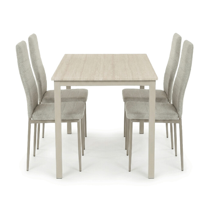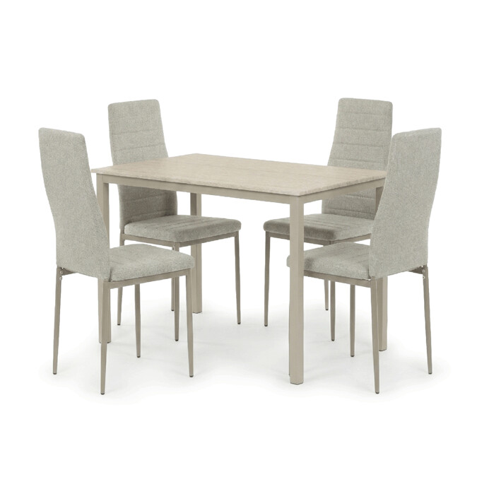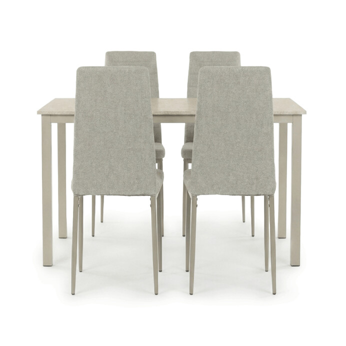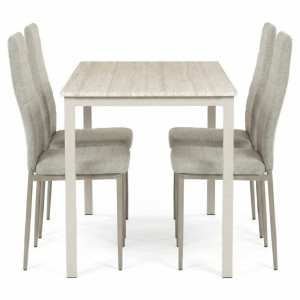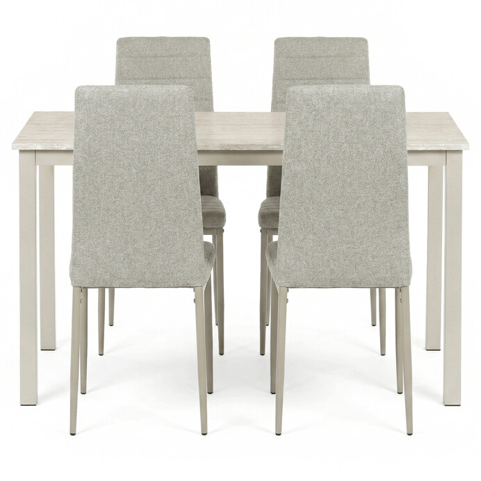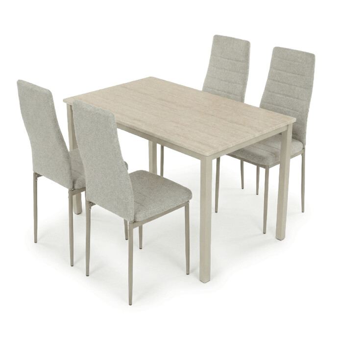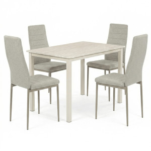 Dotaz na produkt Na splátky ještě dnesJídelní set 1+4 kombinuje praktický stůl s rozměry 110x70x75 cm a čtyři pohodlné židle v krémovém odstínu. Deska stolu je vyrobena z MDF s dekorativním povrchem v odstínu travertinu, který napodobuje přírodní kámen a snadno se udržuje. Stabilní kovové nohy stolu v barvě cashmere zajišťují pevnost a dlouhou životnost, zatímco židle mají kovovou konstrukci v cappuccino odstínu a jsou čalouněné příjemnou látkou, která podporuje komfort při sezení. Nadčasový design celého setu se hodí do různých interiérů a díky kvalitnímu zpracování je vhodný pro každodenní použití v domácnosti i menších provozech.