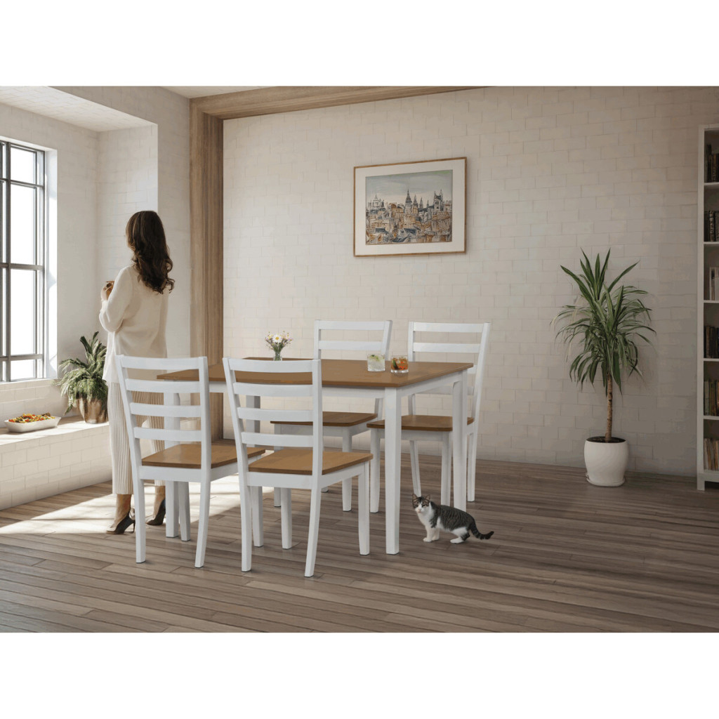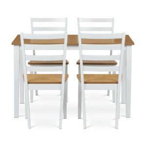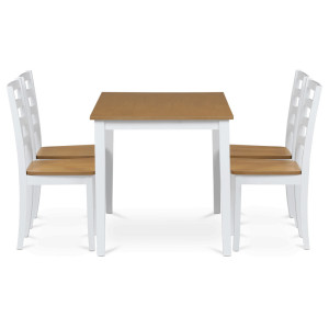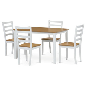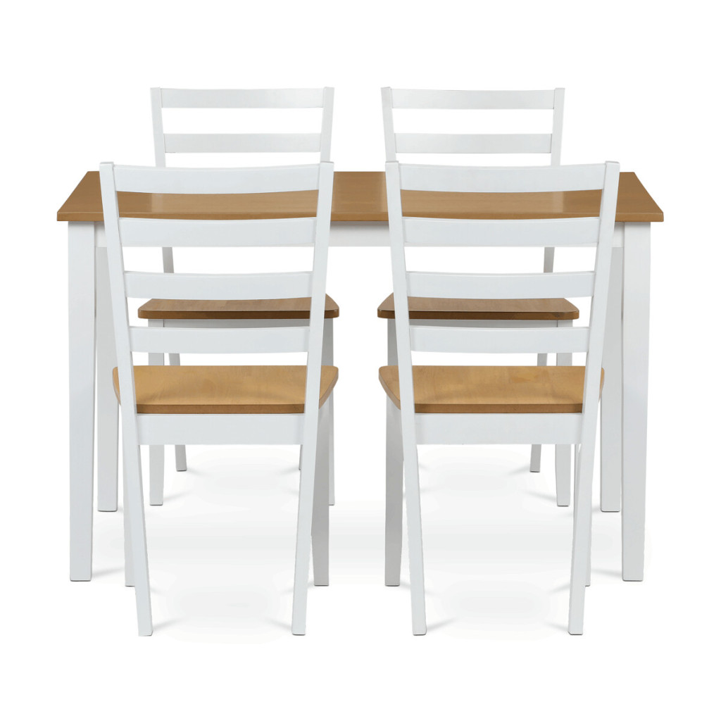 Dotaz na produkt Na splátky ještě dnesVneste do svého domova harmonii s elegantním jídelním setem značky Autronic. Kombinace bílých masivních nohou a desky v přírodním dubovém dekoru přidá vašemu interiéru moderní a svěží vzhled. Set zahrnuje stůl a čtyři židle, které nabízí pohodlí a stabilitu díky preciznímu zpracování z MDF materiálu s dýhou a masivním dřevem. Tento jídelní set je ideální volbou pro rodinné večeře i posezení s přáteli. Vytvořte si stylovou a funkční jídelnu s nadčasovým designem!